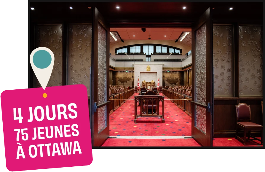 Provenant de partout au pays, 75 jeunes âgés de 16 à 20 ans se réuniront dans la Chambre du Sénat pour vivre des débats législatifs, des travaux en comité et des périodes de questions dans le cadre de cette expérience immersive de quatre jours.
